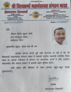 आदरणीय नि. कैबिनेट मंत्री राष्ट्रीय विश्वकर्मा कल्याण बोर्ड मध्य प्रदेश सरकार एवं राष्ट्रीय अध्यक्ष श्री विश्वकर्मा महापंचायत संगठन भारत द्वारा विपिन कुमार सोनी को संगठन का राष्ट्रीय महामंत्री नियुक्त किया गया है।
